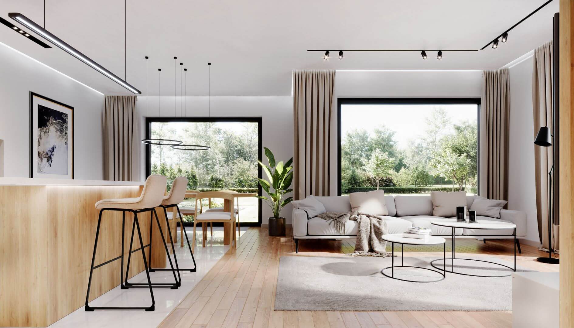 Koncepcja modern barn pozwala wdrożyć kreatywne projekty wnętrz. Pomieszczenia są ustawne i wysokie. Liczne przeszklenia otwierają dom na piękny, obszerny ogród i otulające teren inwestycji lasy. Architekci stojący za projektem zadbali o to, aby wyróżnić w domach część dzienną i nocną. Każda pełni inne funkcje, ma odmienny charakter, jak również godziny nasłonecznienia. W domach SETNO nie ma miejsca na przypadek, tu wszystko pracuje dla Ciebie.